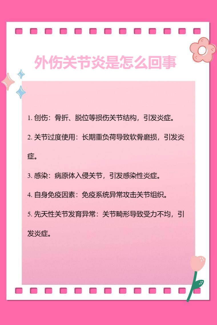 外伤关节炎通常由创伤、关节过度使用、感染、自身免疫因素、先天性关节发育异常等引起。