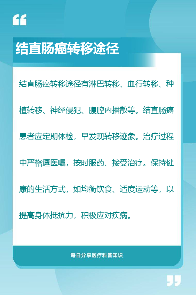 结直肠癌转移途径有淋巴转移、血行转移、种植转移、神经侵犯、腹腔内播散等。
