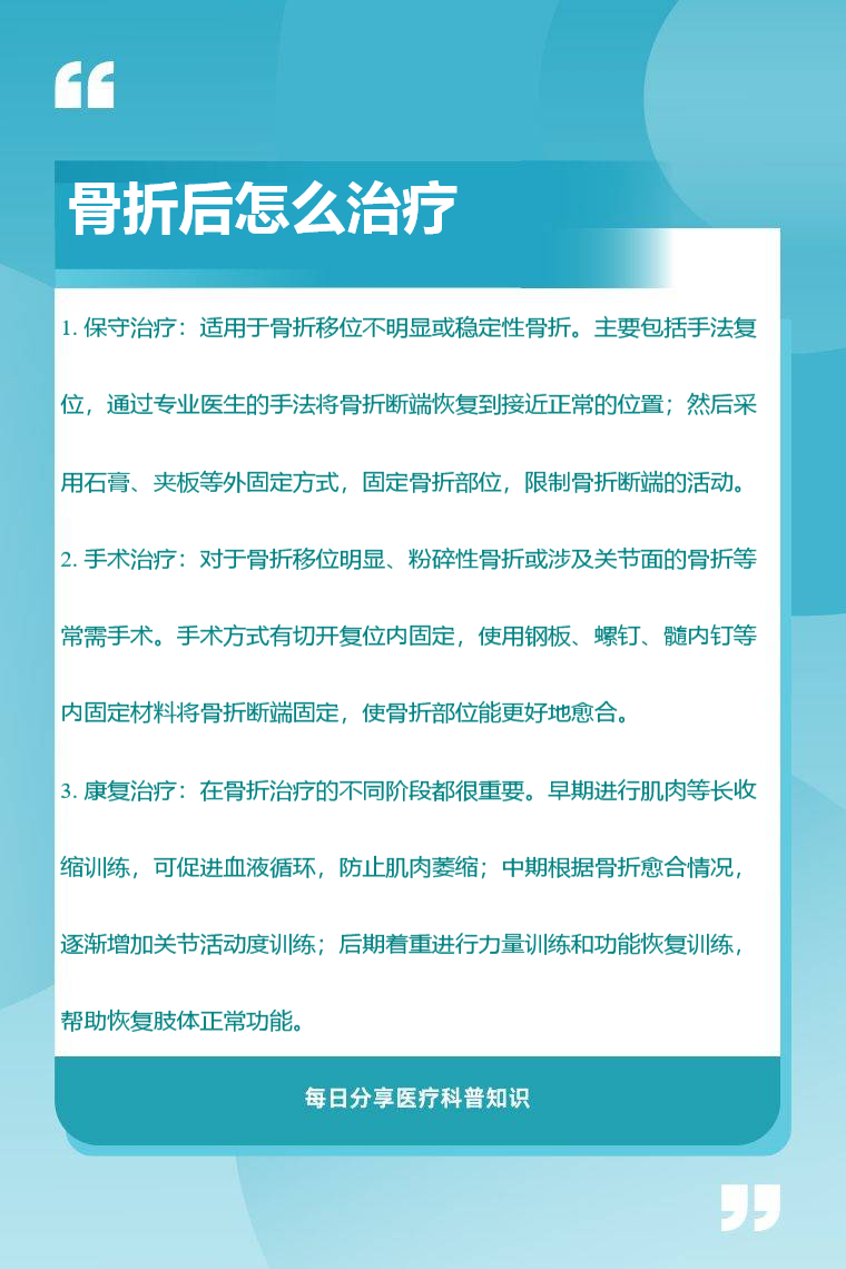 骨折后的治疗方法有保守治疗、手术治疗、康复治疗等。