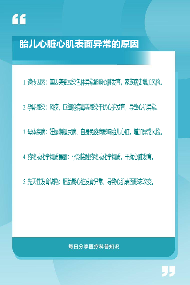 胎儿心脏心肌表面异常的原因包括遗传因素、孕期感染、母体疾病、药物或化学物质暴露、先天性发育缺陷等。