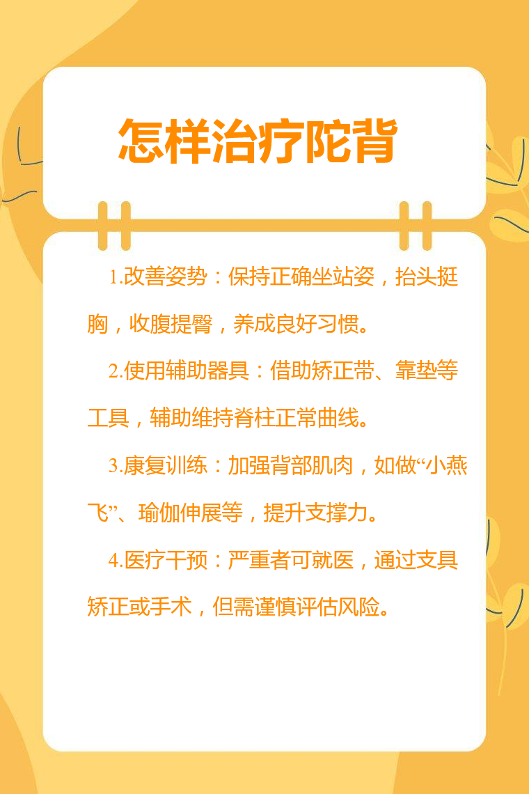 治疗驼背的方法有改善姿势、使用辅助器具、进行康复训练、接受医疗干预等。