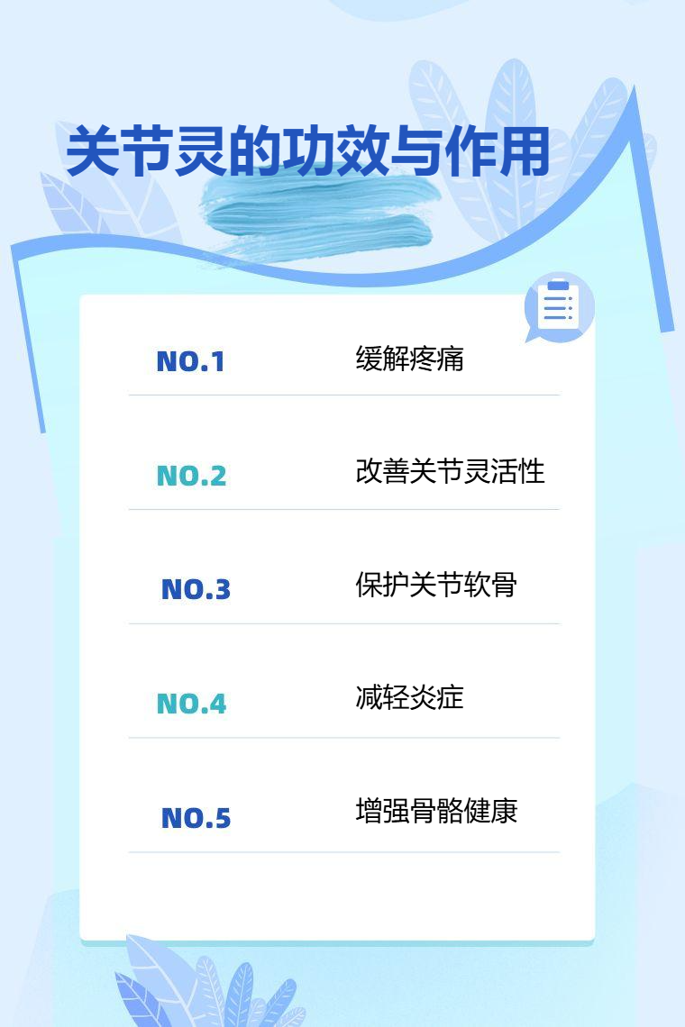 关节灵具有缓解疼痛、改善关节灵活性、保护关节软骨、减轻炎症、增强骨骼健康等功效与作用。