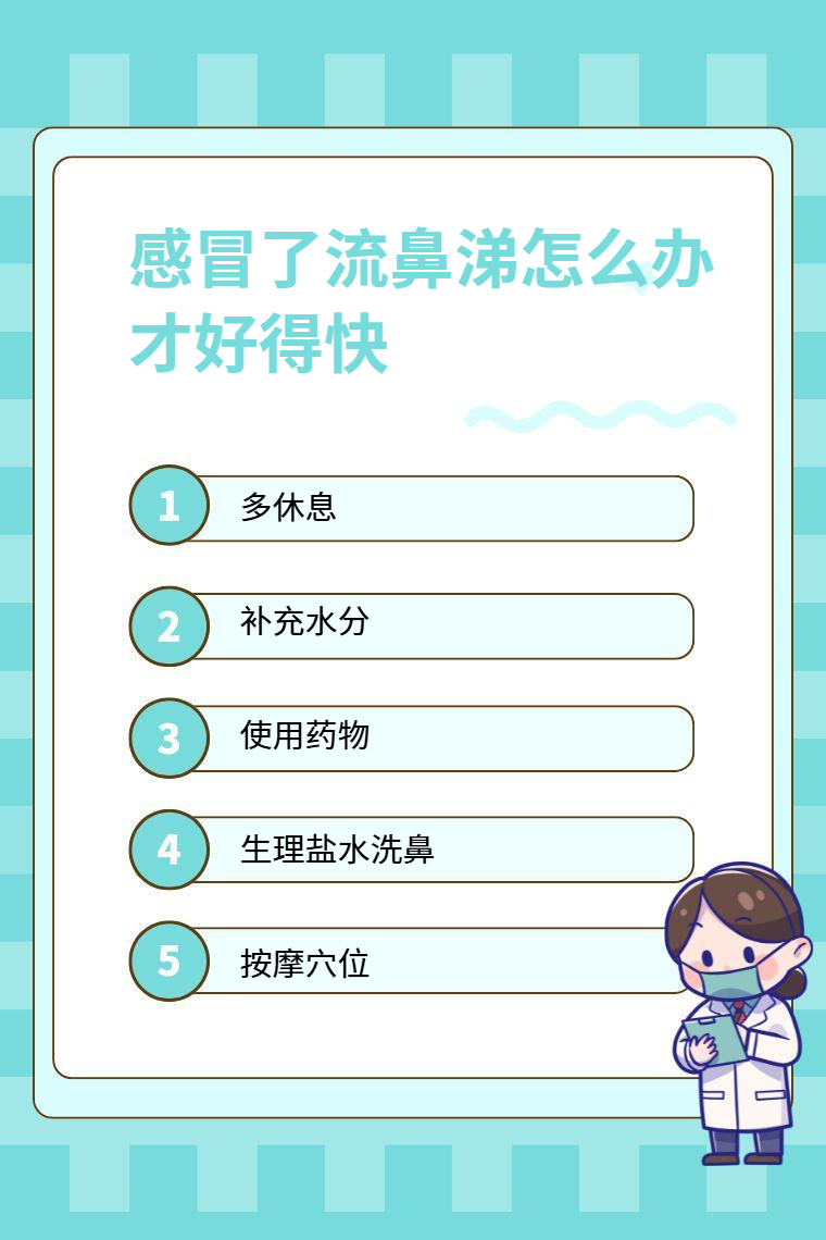 感冒流鼻涕想要好得快可通过多休息、补充水分、使用药物、生理盐水洗鼻、按摩穴位等。