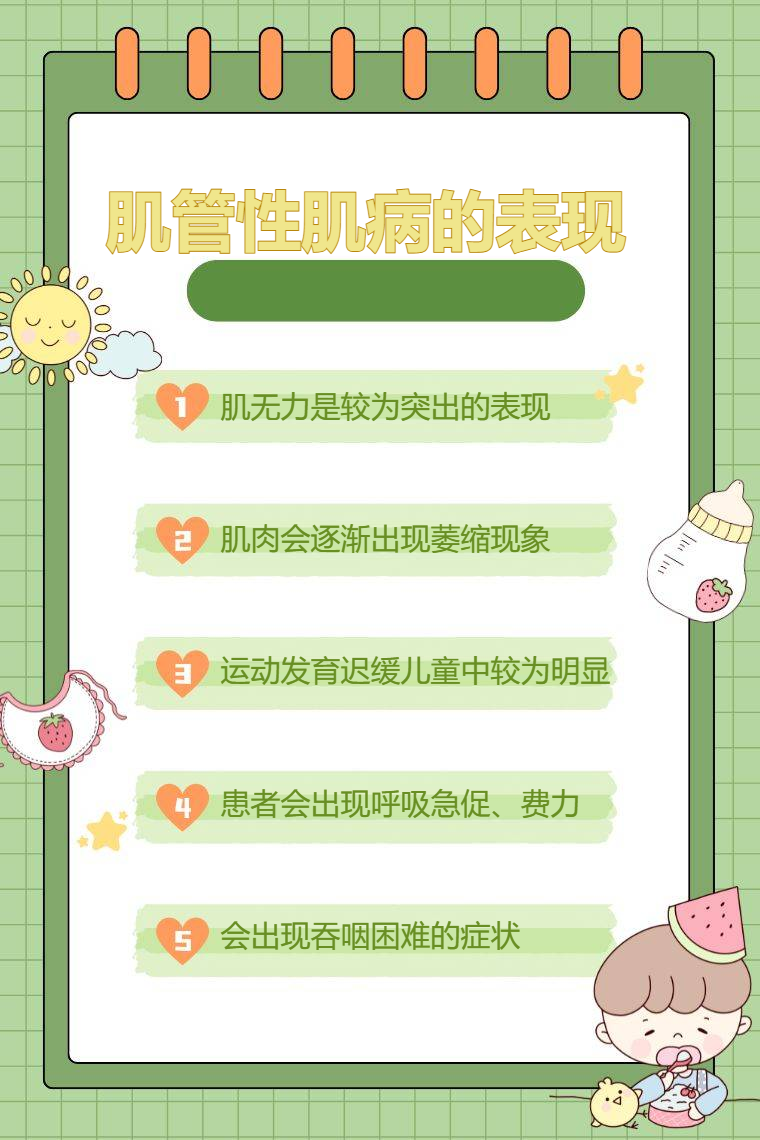 肌管性肌病的表现有肌无力、肌萎缩、运动发育迟缓、呼吸功能障碍、吞咽困难等。