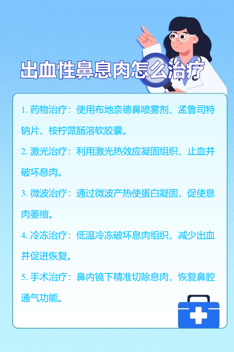出血性鼻息肉的治疗方法有药物治疗、激光治疗、微波治疗、冷冻治疗、手术治疗等。