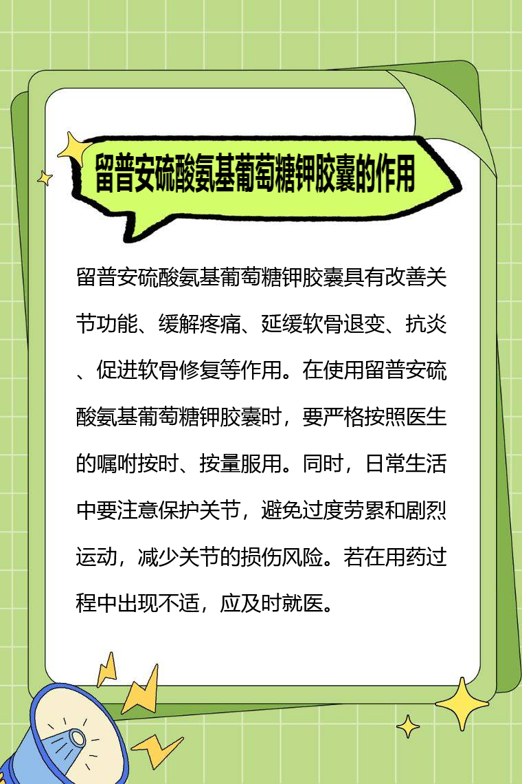 留普安硫酸氨基葡萄糖钾胶囊具有改善关节功能、缓解疼痛、延缓软骨退变、抗炎、促进软骨修复等作用。