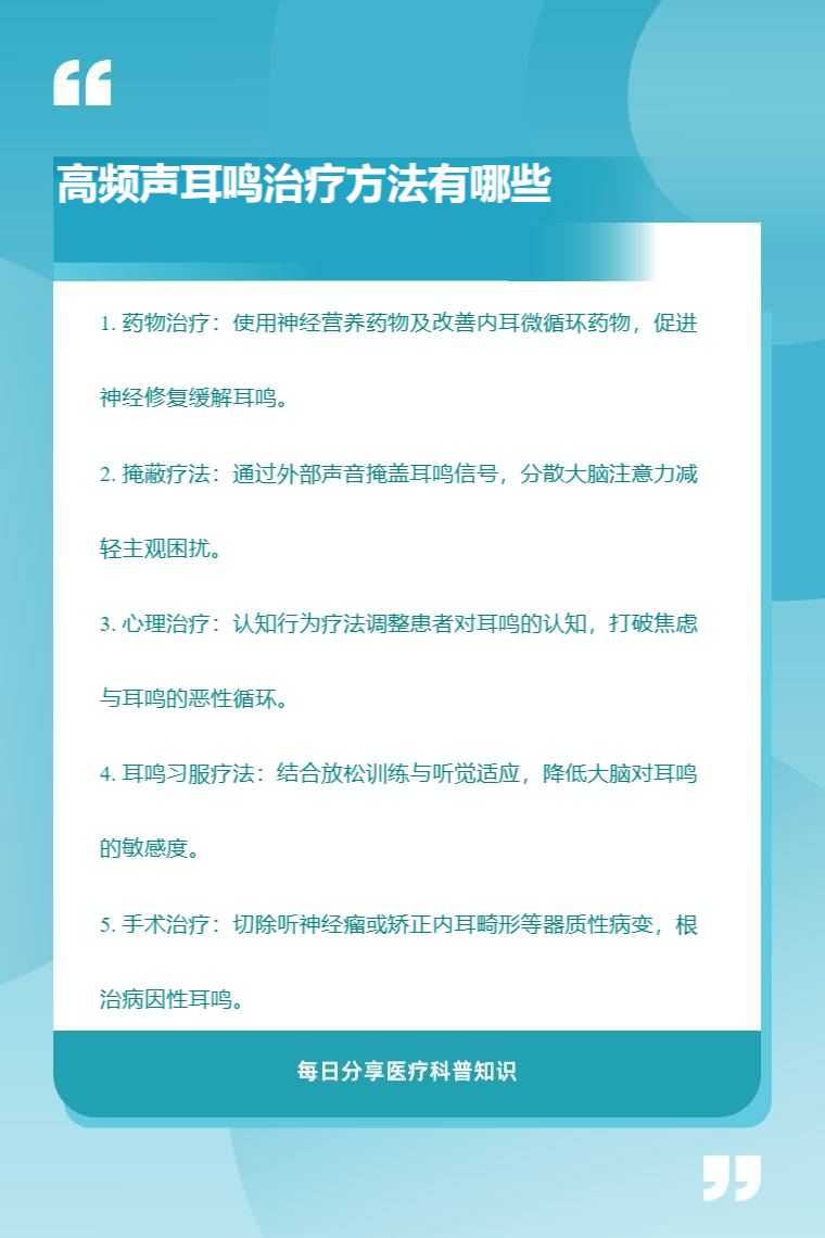 高频声耳鸣的治疗方法有药物治疗、掩蔽疗法、心理治疗、耳鸣习服疗法、手术治疗等。