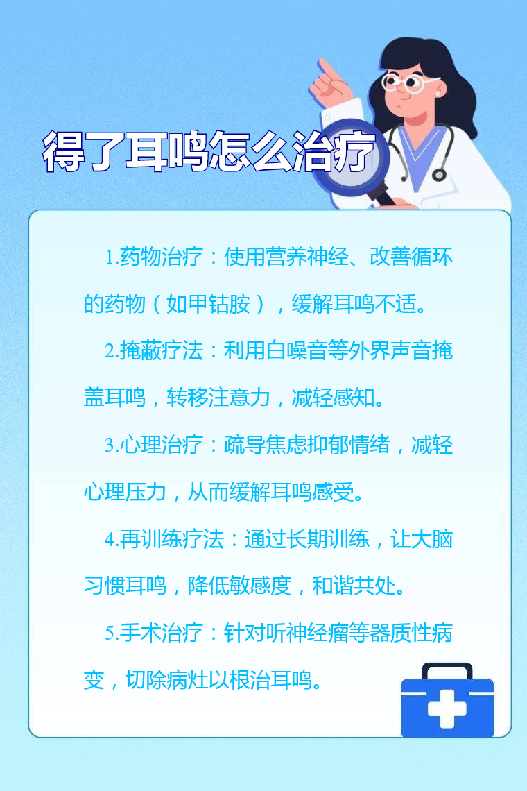 得了耳鸣可通过药物治疗、掩蔽疗法、心理治疗、耳鸣再训练疗法、手术治疗等方法来应对。