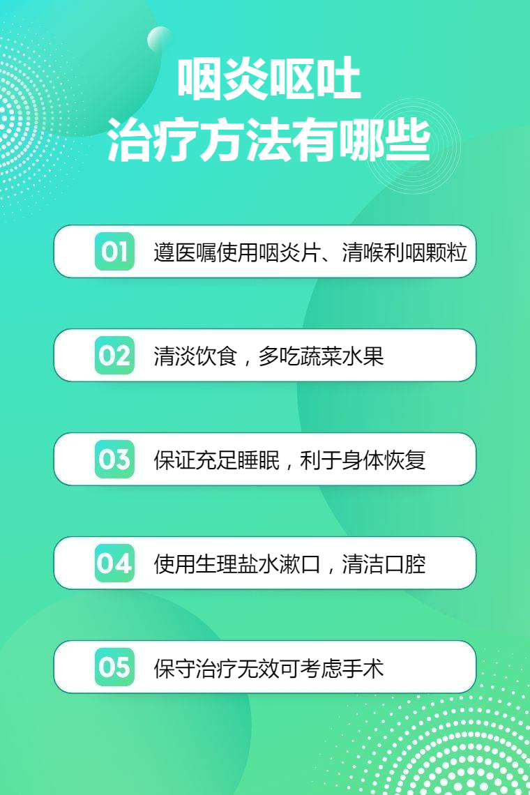 咽炎呕吐的治疗方法有药物治疗、饮食调理、生活习惯改善、物理治疗、手术治疗等。
