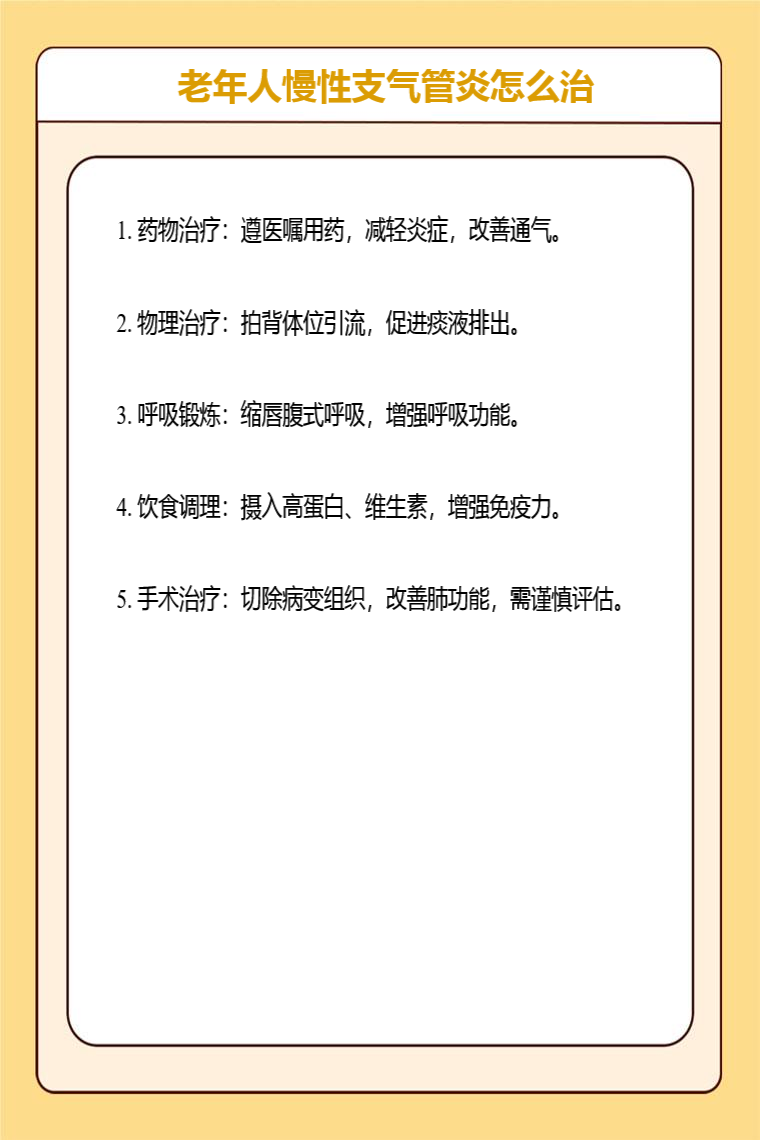 老年人慢性支气管炎的治疗可通过药物治疗、物理治疗、呼吸锻炼、饮食调理、手术治疗等。