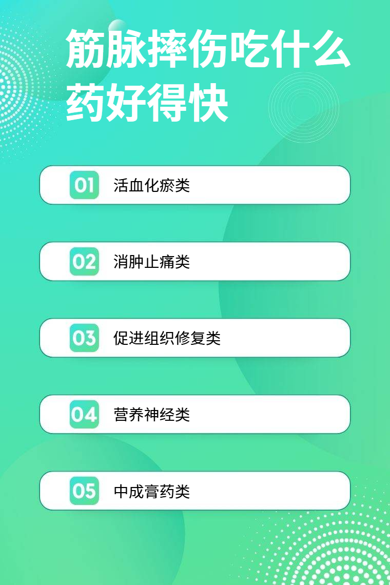 筋脉摔伤可选择活血化瘀类、消肿止痛类、促进组织修复类、营养神经类、中成膏药类等药物。