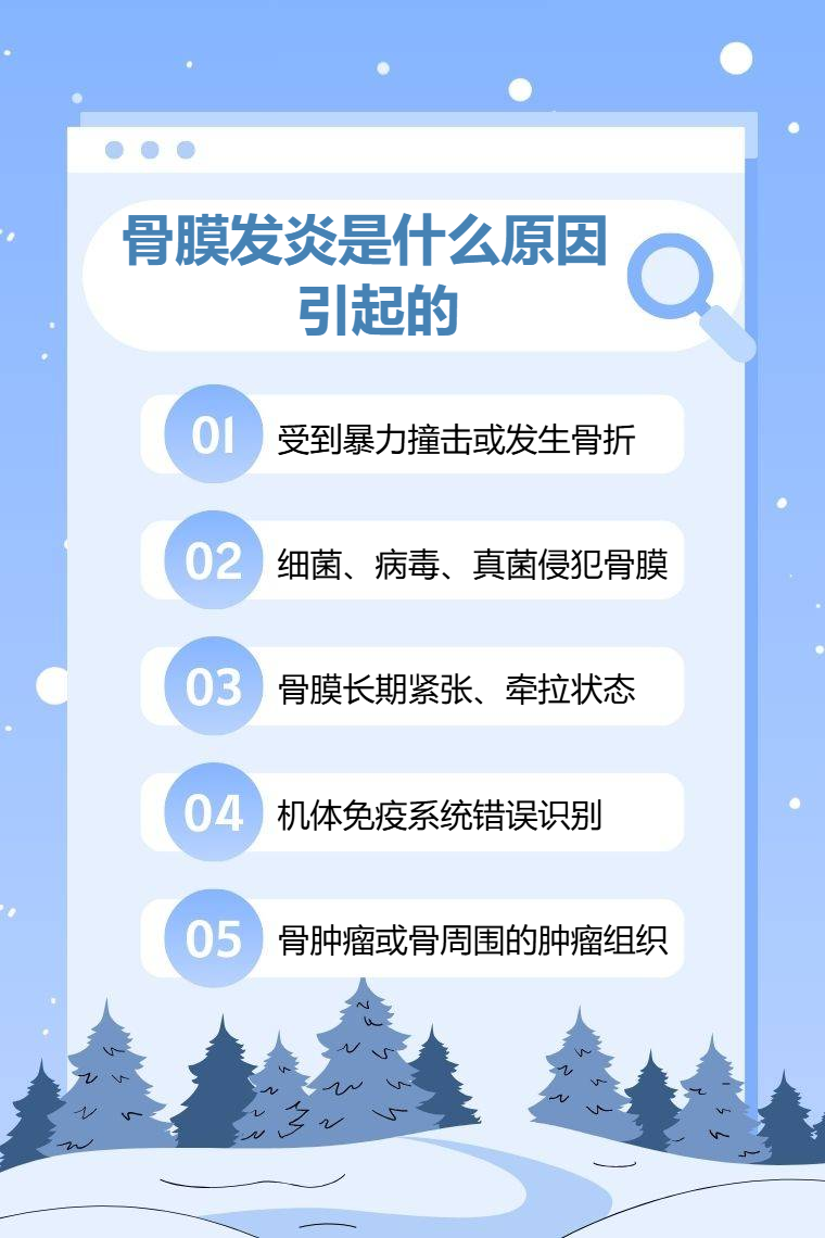 骨膜发炎通常由外伤、感染、慢性劳损、自身免疫性疾病、肿瘤等原因引起等。