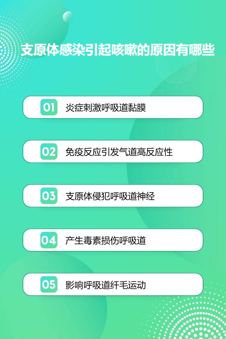 支原体感染引起咳嗽的原因有炎症刺激呼吸道黏膜、免疫反应引发气道高反应性、支原体侵犯呼吸道神经、产生毒素损伤呼吸道、影响呼吸道纤毛运动等。