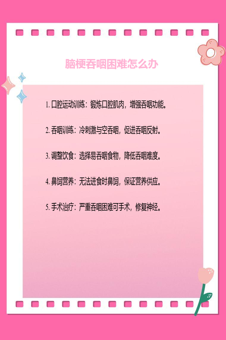 1. 口腔运动训练:脑梗导致吞咽困难,是因脑部病变影响神经功能,使口腔肌肉协调性变差。通过口腔运动训练,如鼓腮、吹口哨、伸舌等动作,可锻炼口腔肌肉力量和协调性,增强吞咽相关肌肉功能,为正常吞咽创造条件。具体可让患者反复进行鼓腮动作,每次保持数秒后放松,再进行吹口哨练习,尽力吹出声音,伸舌时尽量向前、向上、向下伸展,每个动作重复多次。