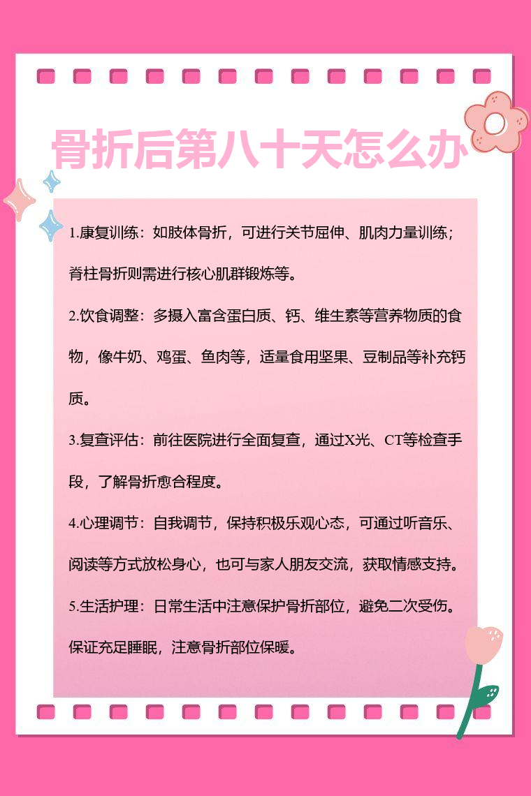骨折后第八十天处于恢复关键期,要严格按照医生指导进行康复训练与护理,保持良好生活习惯与心态,定期复查,以便及时发现并解决问题,促进骨折更好恢复。
