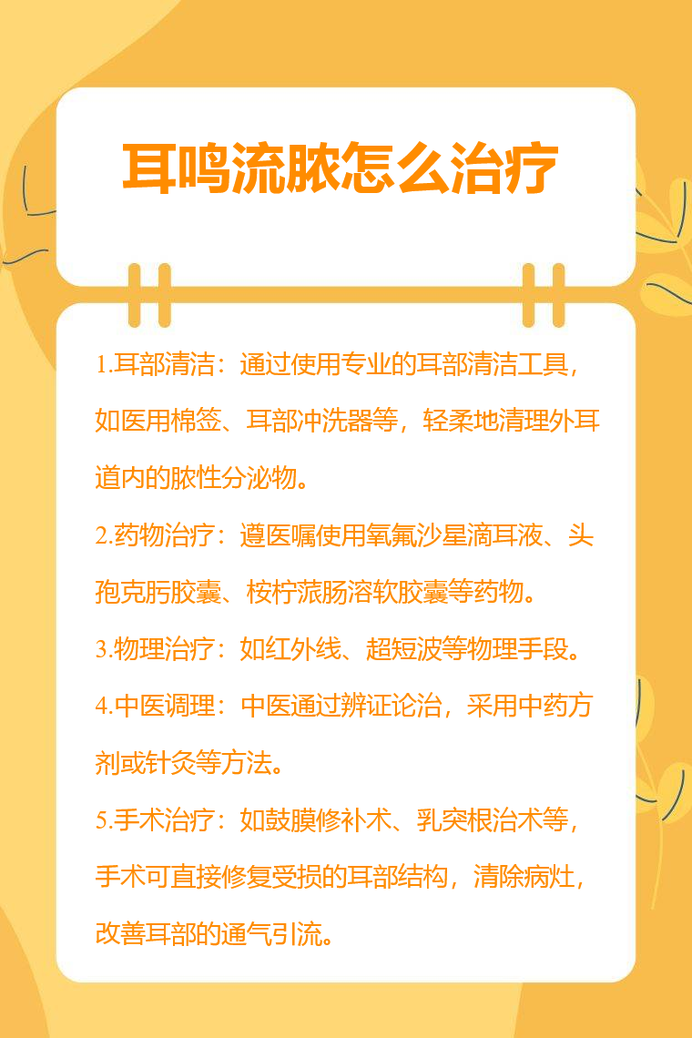耳鸣流脓可通过耳部清洁、药物治疗、物理治疗、中医调理、手术治疗等方法进行治疗。