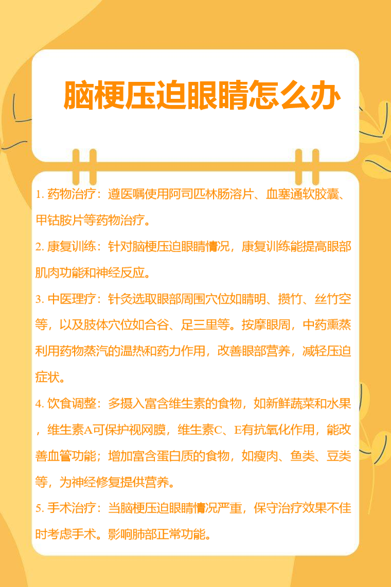 脑梗压迫眼睛可通过药物治疗、康复训练、中医理疗、饮食调整、手术治疗等方法来应对。