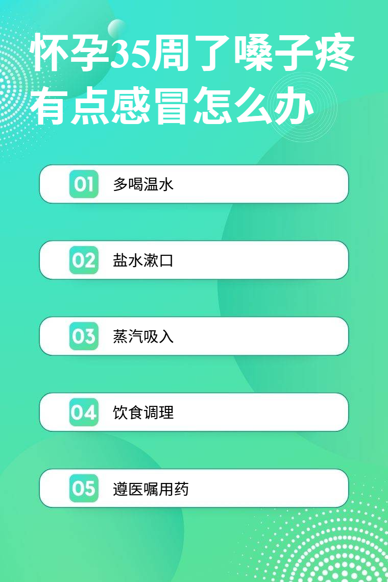怀孕 35 周嗓子疼有点感冒可以通过多喝温水、盐水漱口、蒸汽吸入、饮食调理、遵医嘱用药等方法缓解。