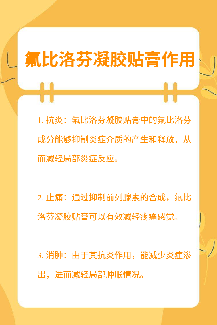1. 抗炎:氟比洛芬凝胶贴膏中的氟比洛芬成分能够抑制炎症介质的产生和释放,从而减轻局部炎症反应。当机体受到损伤或出现疾病引发炎症时,该贴膏可作用于患处,降低炎症因子水平,缓解因炎症导致的红、热等症状,常用于骨关节炎、类风湿关节炎等疾病的炎症控制。