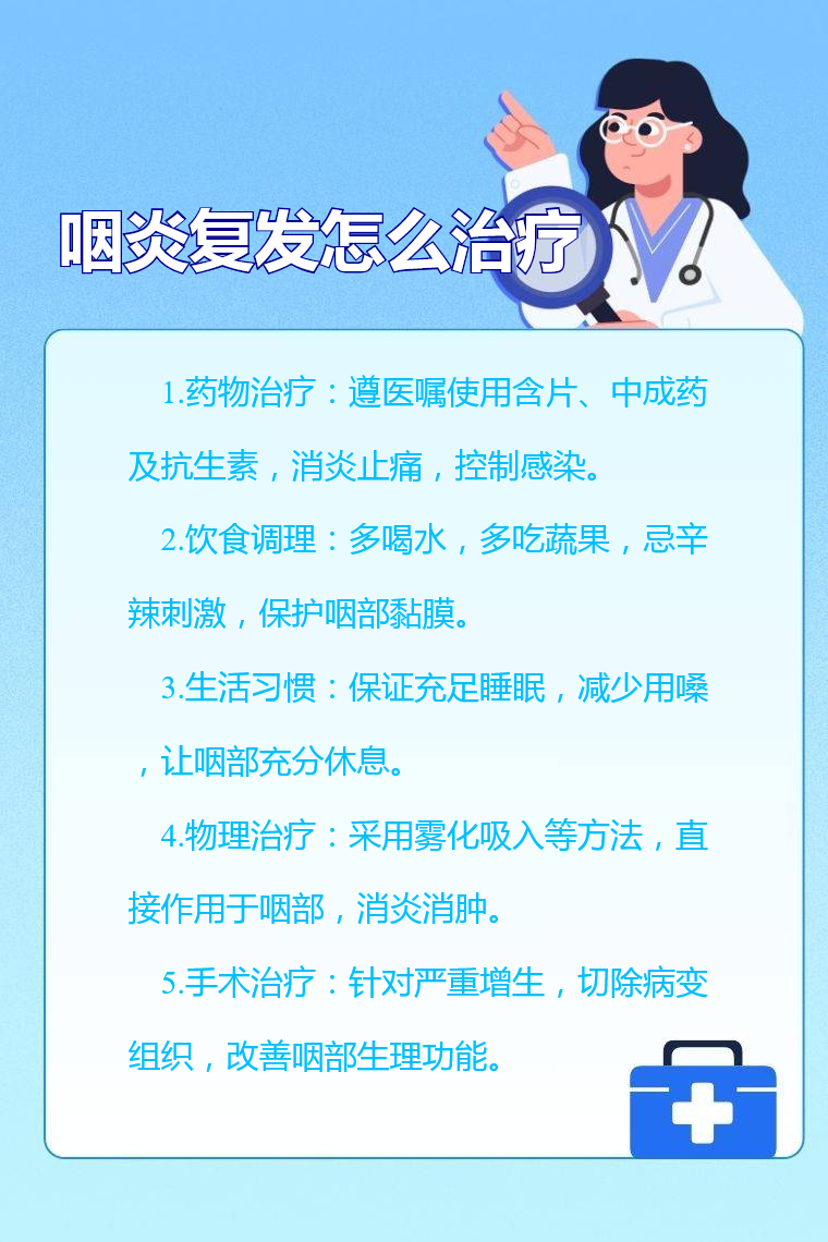 咽炎复发可通过药物治疗、饮食调理、生活习惯改善、物理治疗、手术治疗等方法应对。
