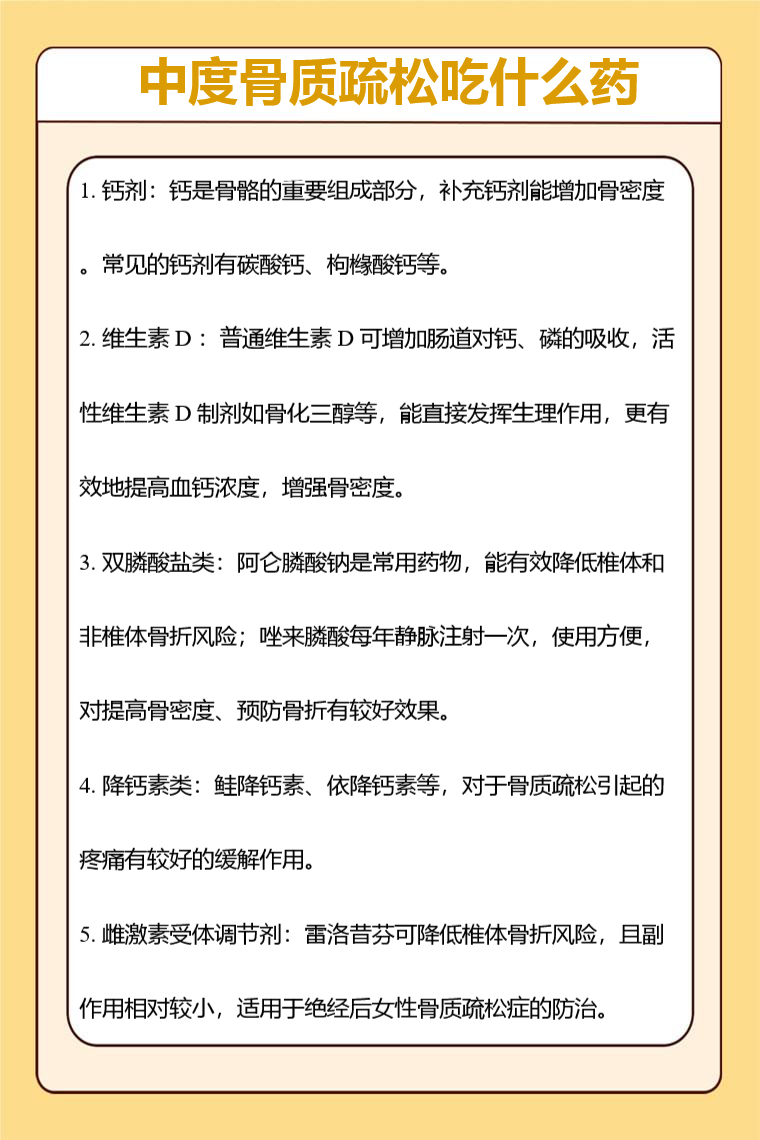 中度骨质疏松可服用钙剂、维生素 D 、双膦酸盐类、降钙素类、雌激素受体调节剂等。