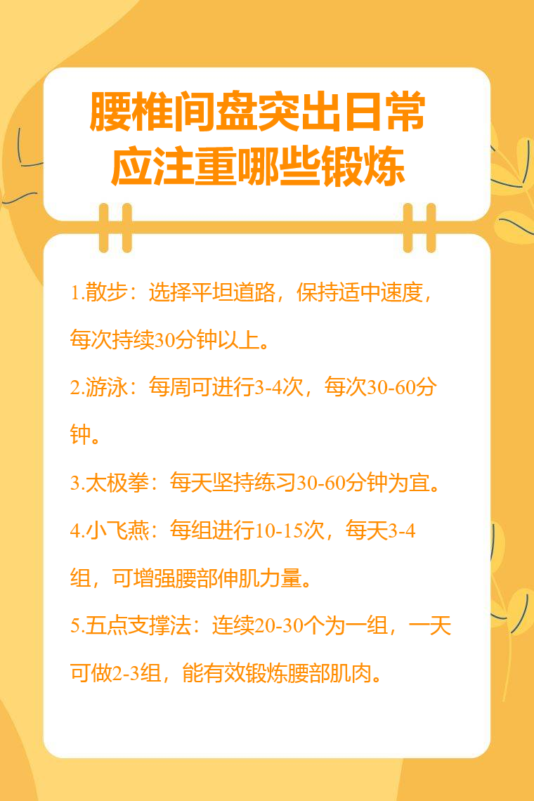 腰椎间盘突出日常应注重的锻炼有散步、游泳、太极拳、小飞燕、五点支撑法等。