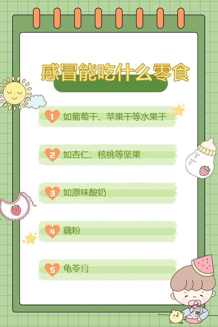 1.水果干:富含维生素和矿物质,像葡萄干、苹果干等,可为身体补充能量和营养,有助于增强抵抗力,缓解感冒不适,且方便保存和食用。
