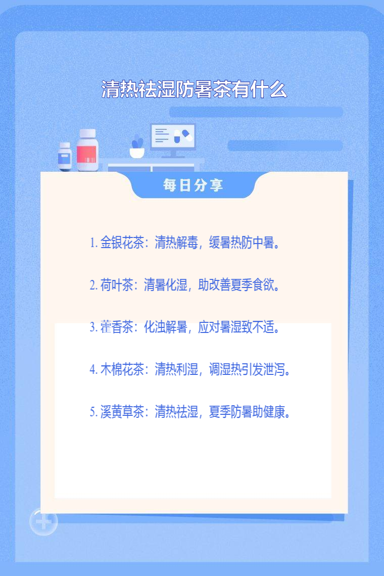 清热祛湿防暑茶有金银花茶、荷叶茶、藿香茶、木棉花茶、溪黄草茶等。