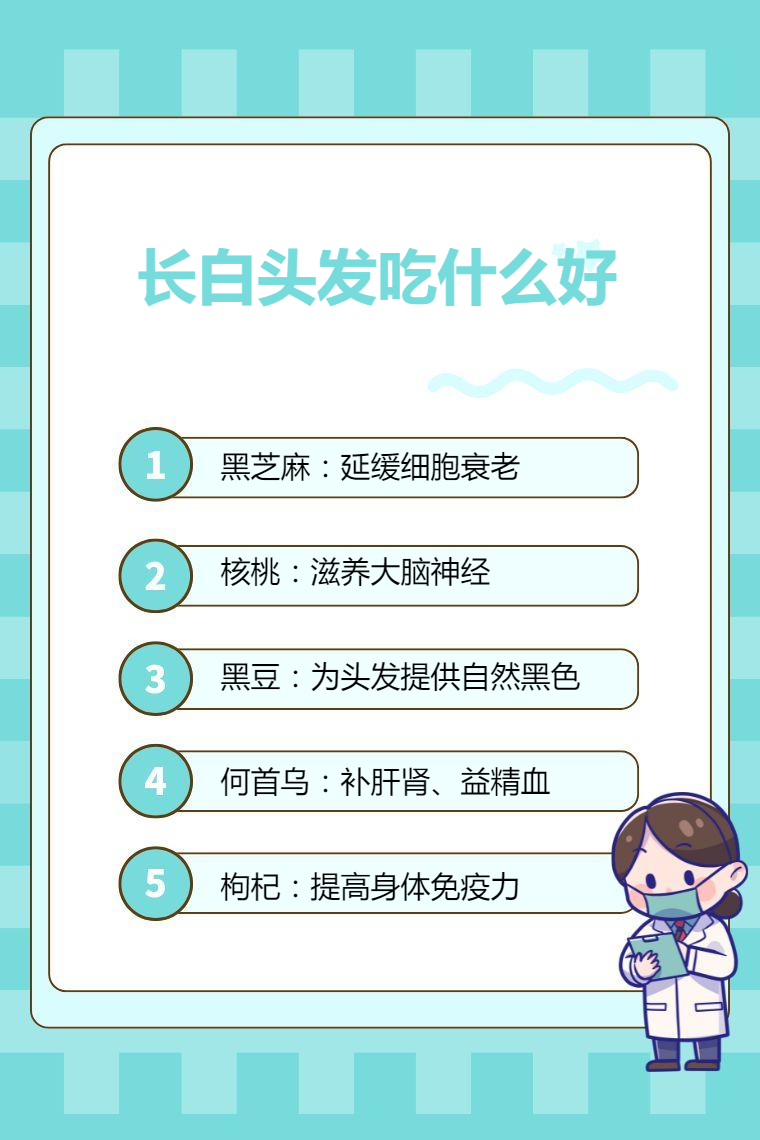 长白头发可通过食用黑芝麻、核桃、黑豆、何首乌、枸杞等来改善。
