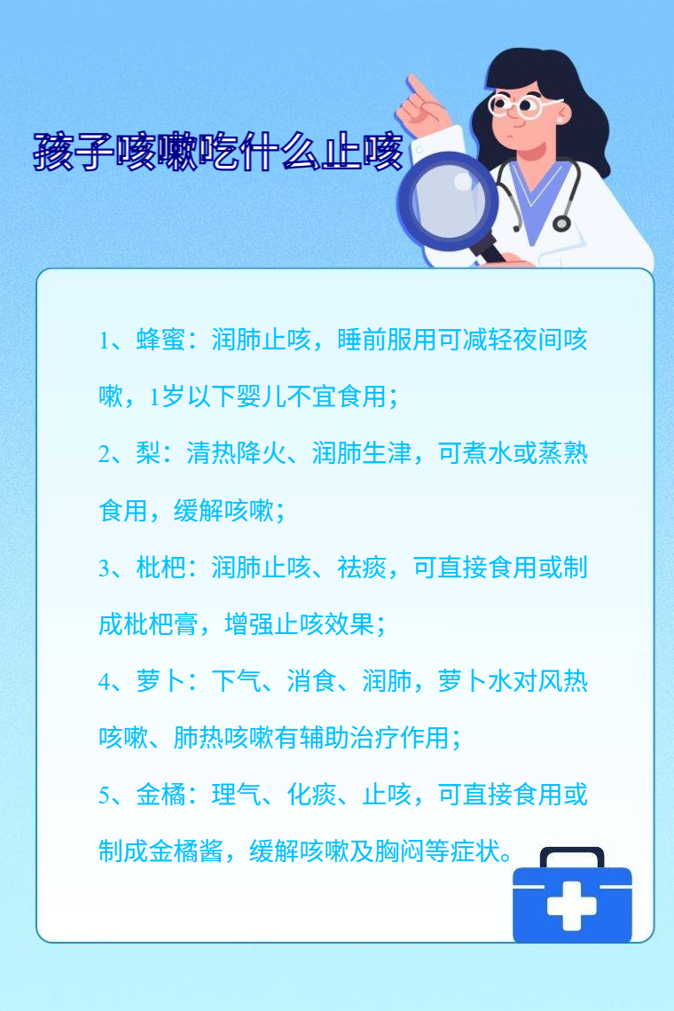 孩子咳嗽可通过食用蜂蜜、梨、枇杷、萝卜、金橘等止咳。