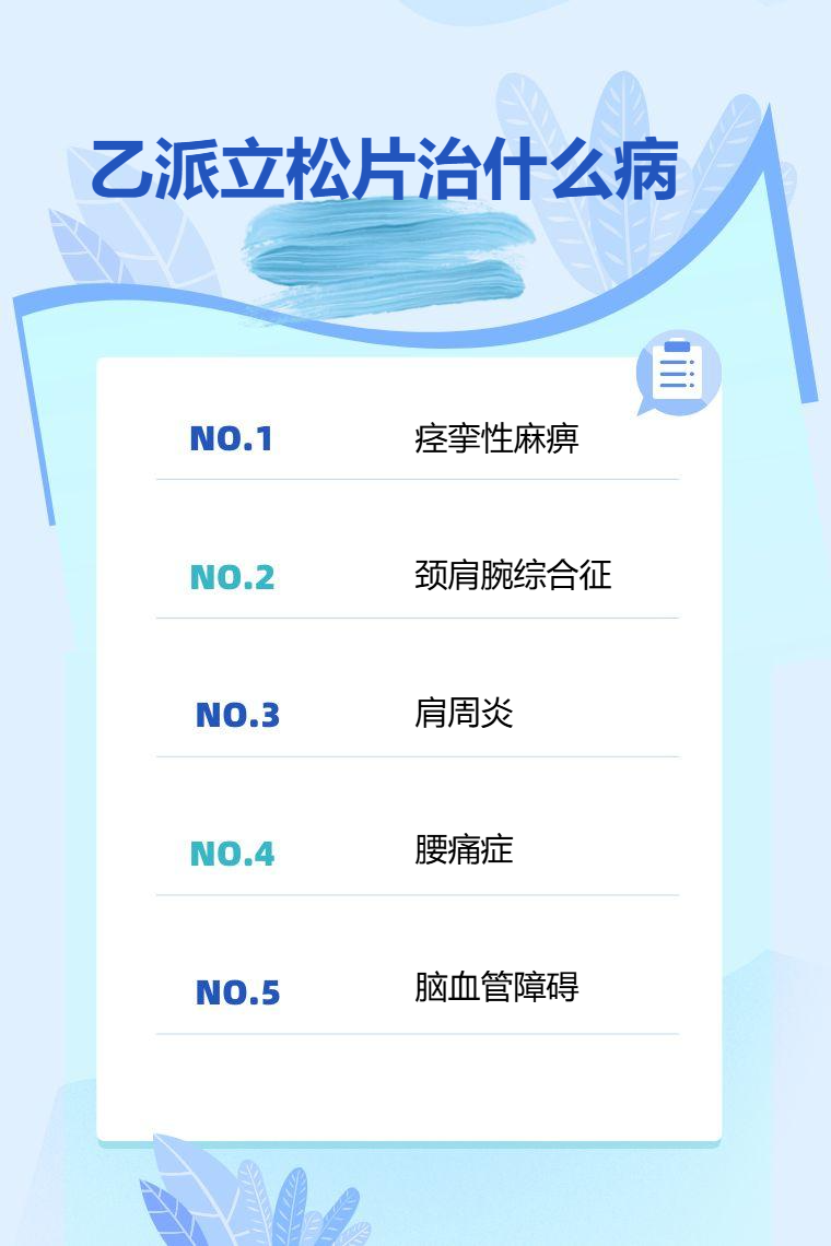 乙派立松片可用于治疗痉挛性麻痹、颈肩腕综合征、肩周炎、腰痛症、脑血管障碍等。
