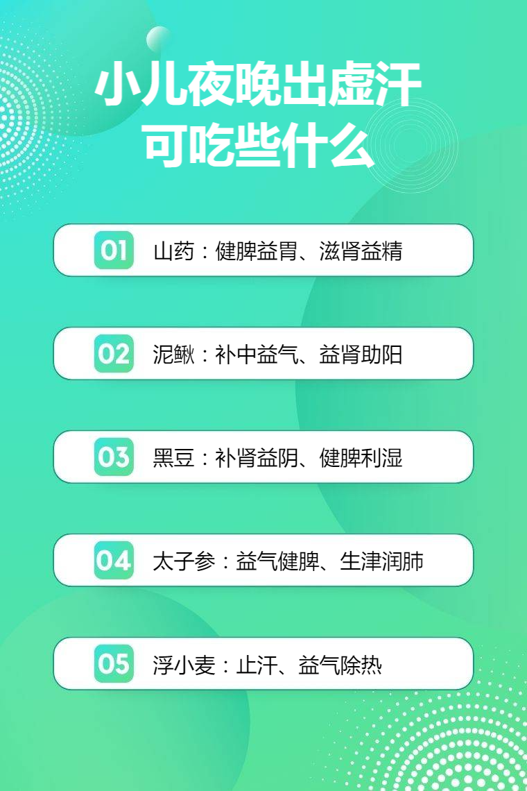 小儿夜晚出虚汗可吃山药、泥鳅、黑豆、太子参、浮小麦等。