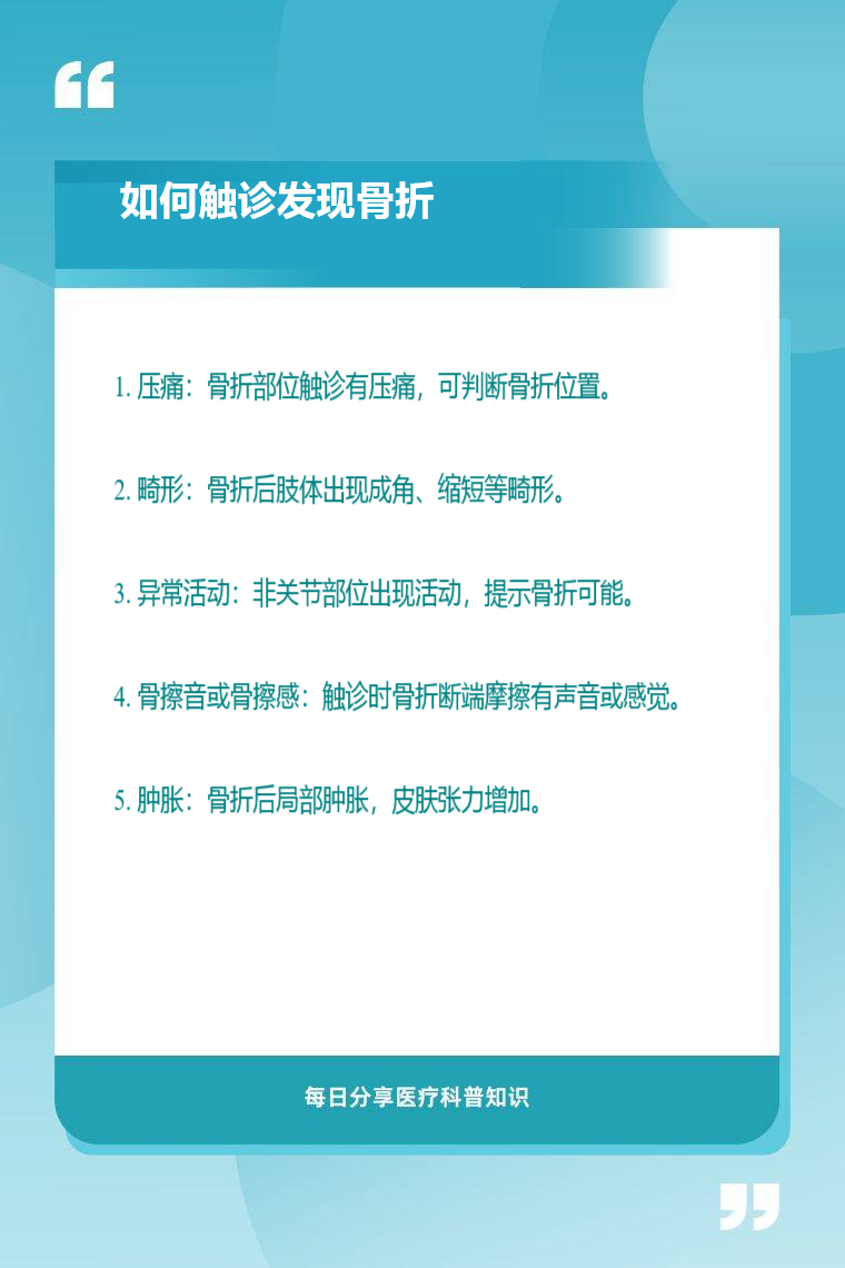 触诊发现骨折可通过压痛、畸形、异常活动、骨擦音或骨擦感、肿胀等。