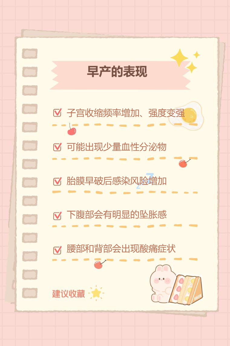 1. 子宫收缩:妊娠晚期子宫会有生理性收缩,但早产时子宫收缩频率增加、强度变强,从偶尔的不规则宫缩发展为规律性宫缩,间隔时间逐渐缩短,持续时间延长,这是早产较为明显的信号。