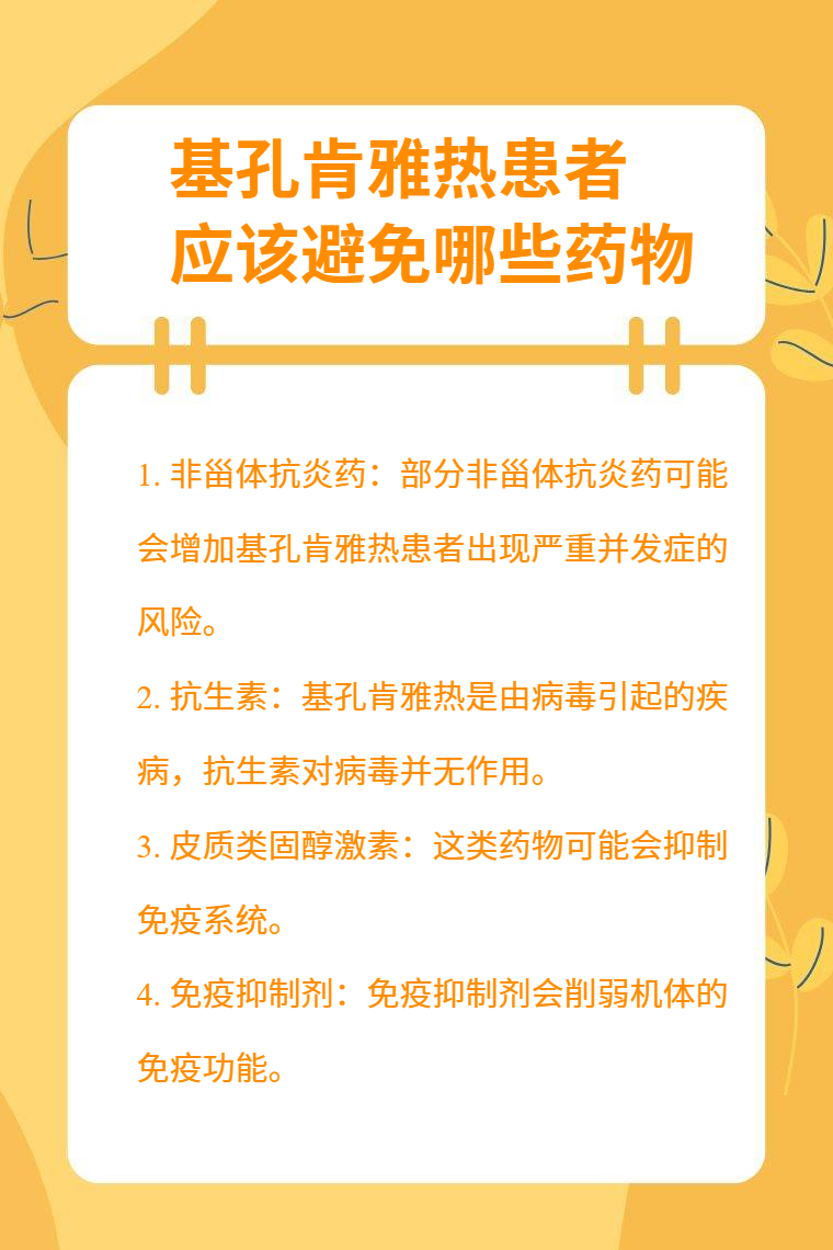 基孔肯雅热患者应该避免非甾体抗炎药、抗生素、皮质类固醇激素、免疫抑制剂等。