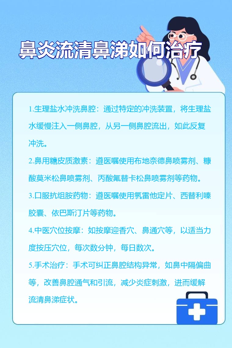 鼻炎患者流清鼻涕可通过使用生理盐水冲洗鼻腔、应用鼻用糖皮质激素、口服抗组胺药物、采用中医穴位按摩、进行手术治疗等方法缓解症状。