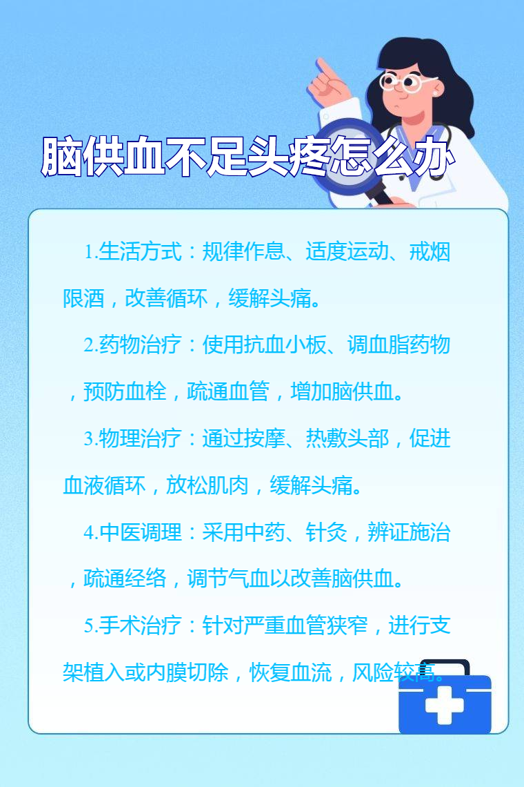 脑供血不足头疼可通过改善生活方式、药物治疗、物理治疗、中医调理、手术治疗等方法缓解。