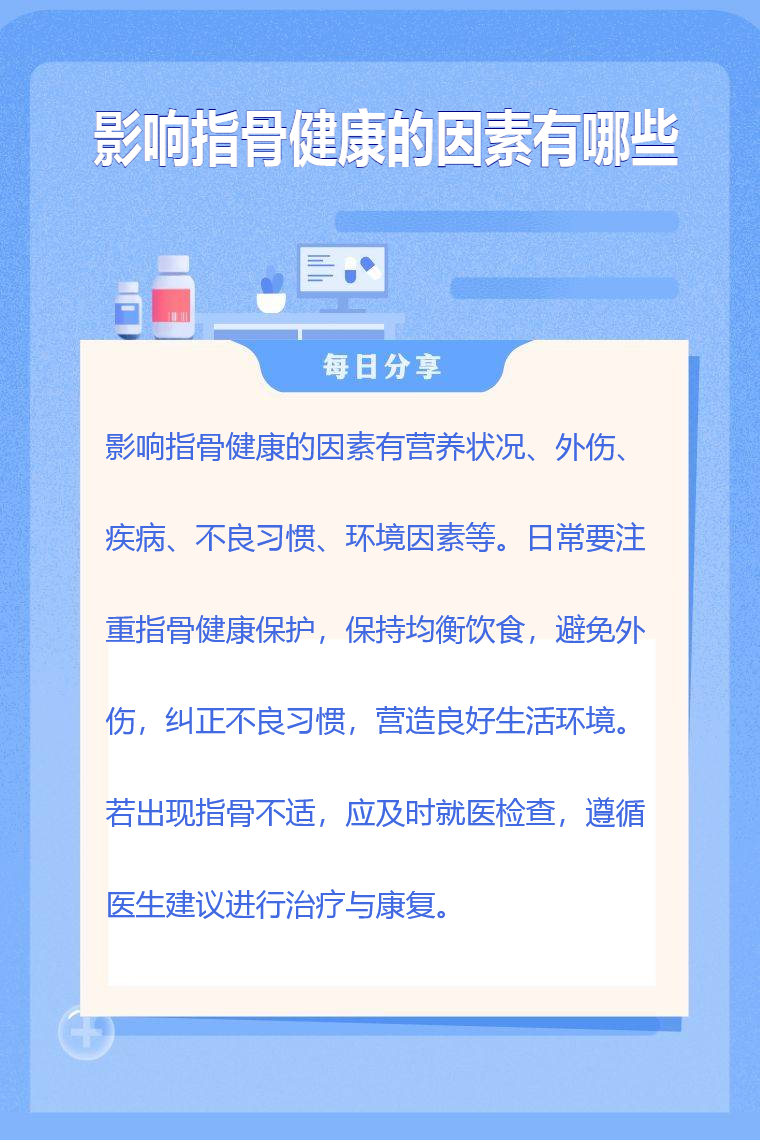 影响指骨健康的因素有营养状况、外伤、疾病、不良习惯、环境因素等。