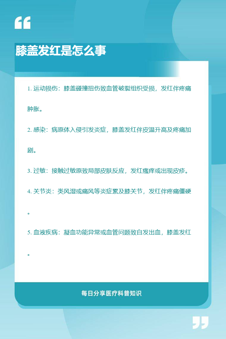 膝盖发红可能由运动损伤、感染、过敏、关节炎、血液疾病等引起。
