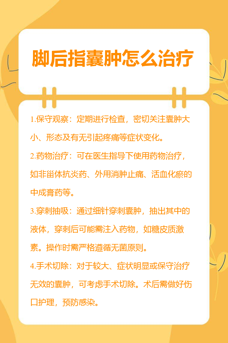 1.保守观察:对于较小且无症状的脚后指囊肿,可选择保守观察。定期进行检查,密切关注囊肿大小、形态及有无引起疼痛等症状变化。若囊肿未出现异常改变,可不采取其他特殊治疗措施。