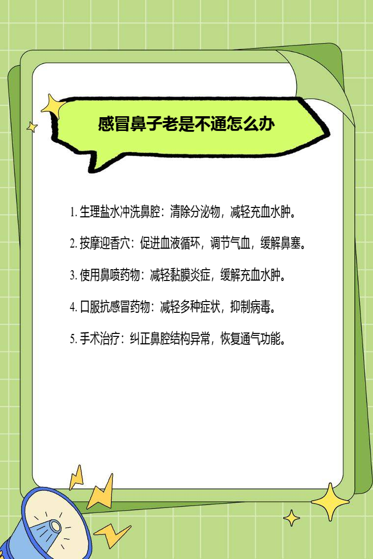 感冒鼻子老是不通可以通过使用生理盐水冲洗鼻腔、按摩迎香穴、使用鼻喷药物、口服抗感冒药物、手术治疗等方法来缓解。