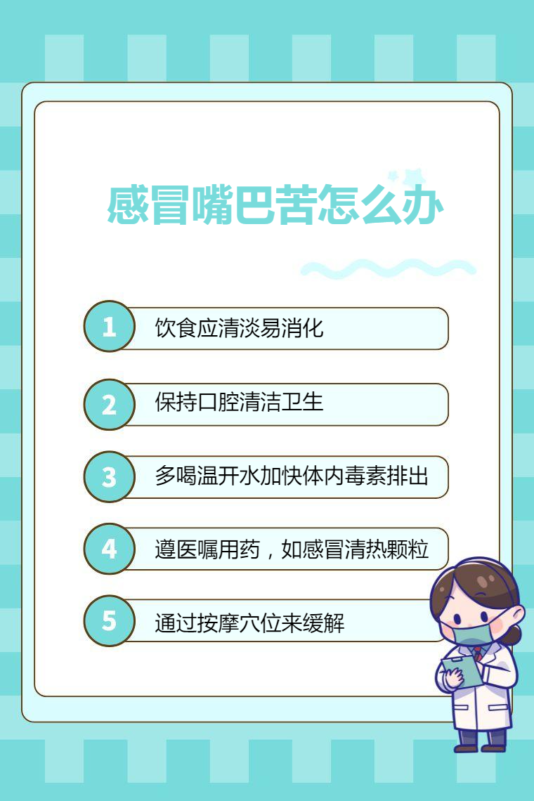 感冒嘴巴苦可通过饮食调整、口腔清洁、补充水分、药物治疗、中医调理等方法来缓解。