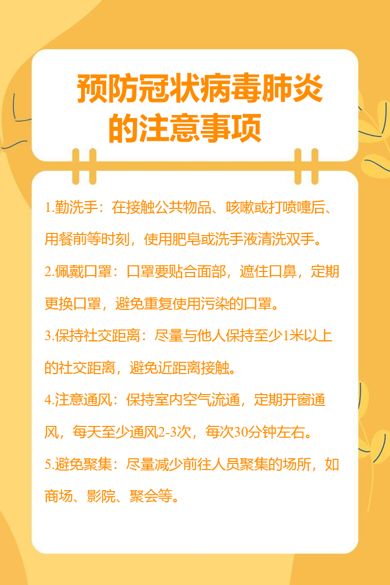 5.避免聚集:尽量减少前往人员聚集的场所,如商场、影院、聚会等,降低感染几率,若必须前往,要做好个人防护措施。