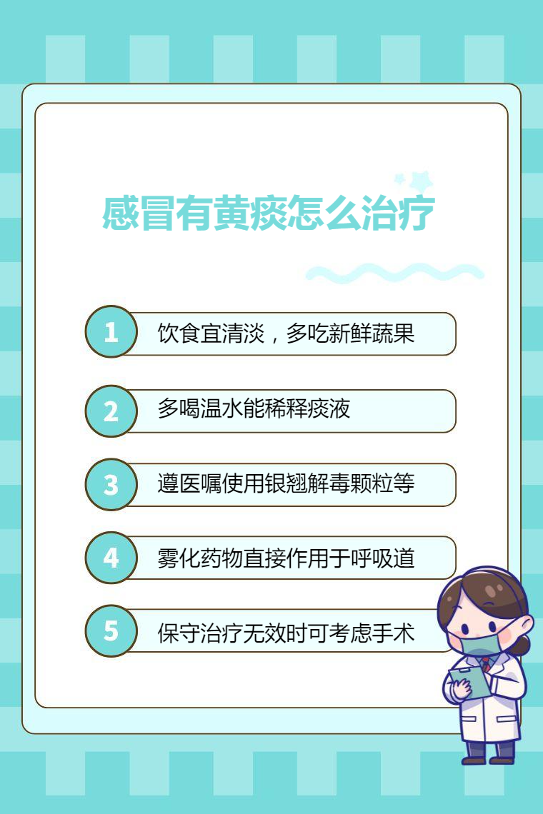 感冒有黄痰可通过调整饮食、增加水分摄入、药物治疗、雾化治疗、手术治疗等方法来应对。