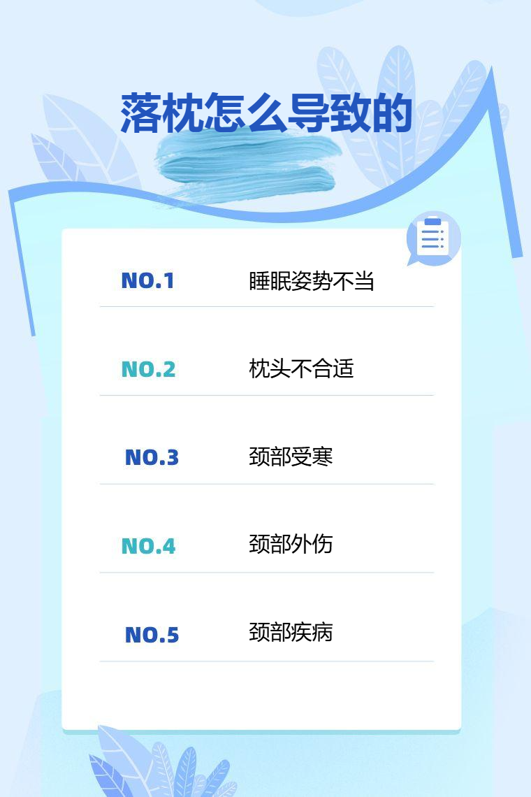 1. 睡眠姿势不当:睡眠时姿势不良,头颈长时间处于过度偏转的位置,或睡眠中长时间保持同一姿势,使颈部肌肉长时间处于紧张状态,得不到放松,容易引起颈部肌肉劳损,进而引发落枕。