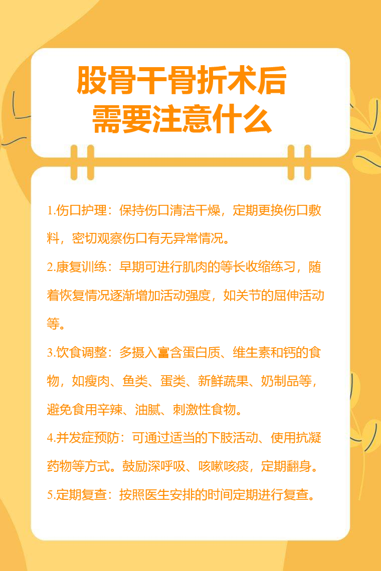 股骨干骨折术后患者需要注意伤口护理、康复训练、饮食调整、并发症预防、定期复查等。