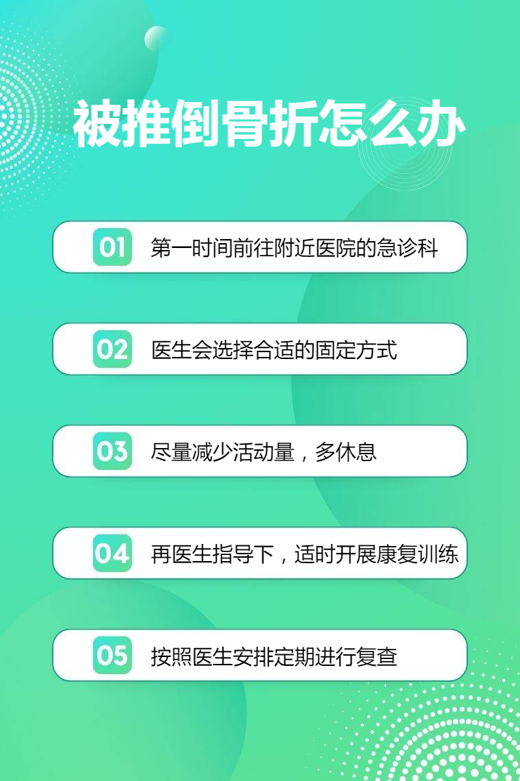 被推倒骨折后可采取及时就医、固定骨折部位、调整生活习惯、进行康复训练、定期复查等措施。