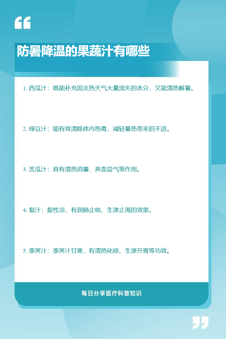 西瓜汁、绿豆汁、苦瓜汁、梨汁、荸荠汁等都是防暑降温的果蔬汁。