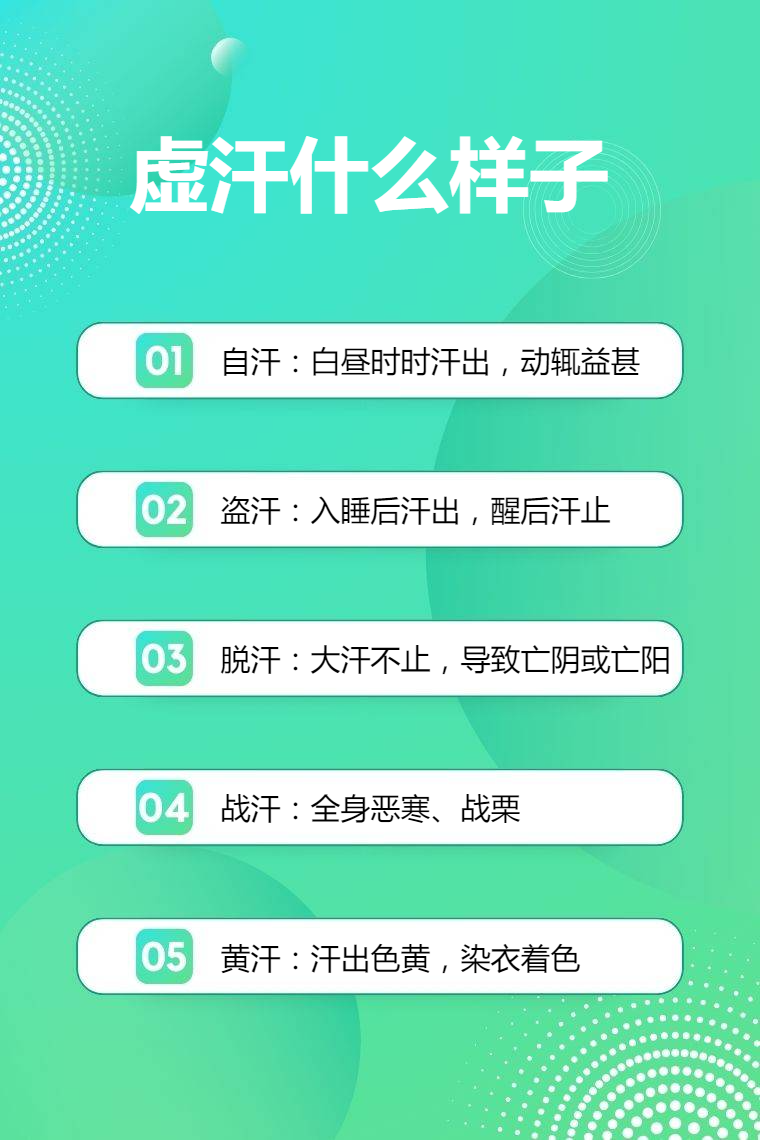 虚汗常见的样子有自汗、盗汗、脱汗、战汗、黄汗等。