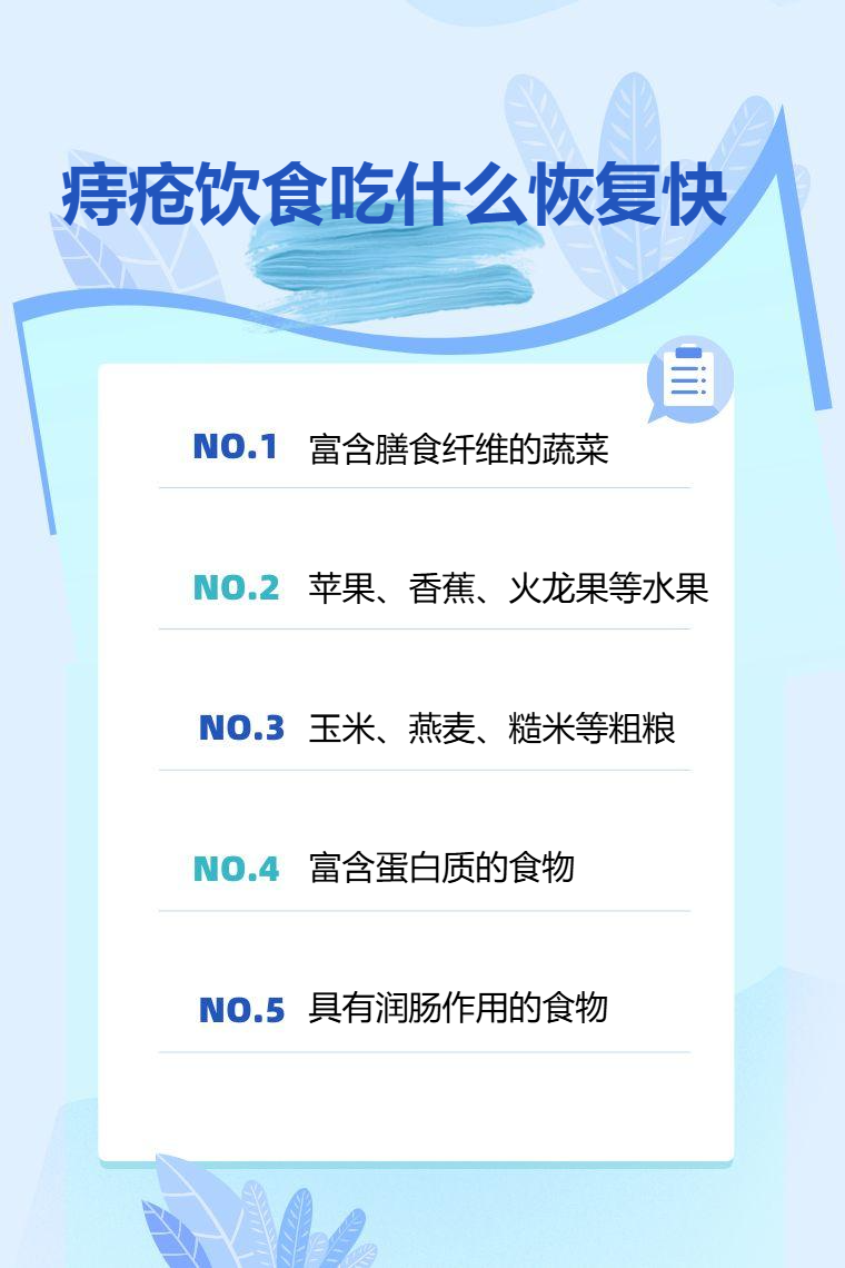 痔疮患者可通过食用富含膳食纤维的蔬菜、水果、粗粮、富含蛋白质的食物、具有润肠作用的食物等促进恢复。